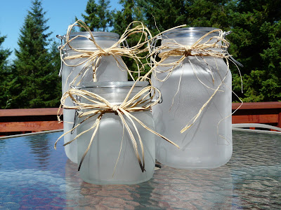 They were extremely easy to make. I just had to find the jars, some cheap garden solar lights (got some $2 ones at Wally World), some Glass Frosting Spray Paint and a little raffia. The inspiration piece used an adhesive glue to attach the solar lights to the lid but I just dug into my trusty scrapbook supplies and used my Terrific Tacky Tape and it worked like a charm.